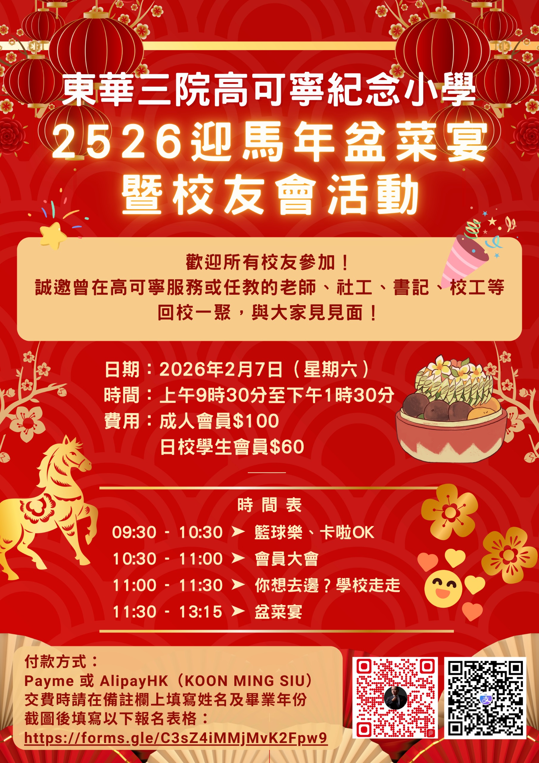 各位校友,本年度第二次活動,於2月7日(星期六)舉行,誠邀校友回母校共聚,共同品嚐傳統盆菜,以及回味校園歲月。當天活動很豐富,籃球樂、卡啦OK、校園走走 及會員大會。今次活動大家可與家人一起參加。活動時詳情見海報。有興趣的校友們請在以下連結報名。