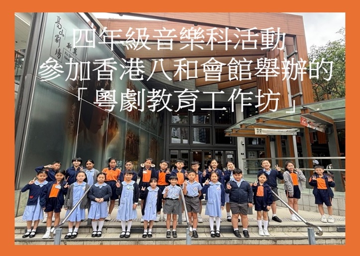 | 2025-10-27 -最近更新- 音樂科活動: 參加香港八和會館舉辦的「粵劇教育工作坊」: 四年級同學在這次的粵劇教育工作坊中除了欣賞《春花笑六郎》第一場及《白蛇傳》之〈盜草〉外,更有機會親身感受用作浸潤「片子」的「刨花」。同學不但陶醉於有趣的故事情節,而且被武場中的耍棍、翻騰等所吸引,目不轉睛,十分投入。[連結] |