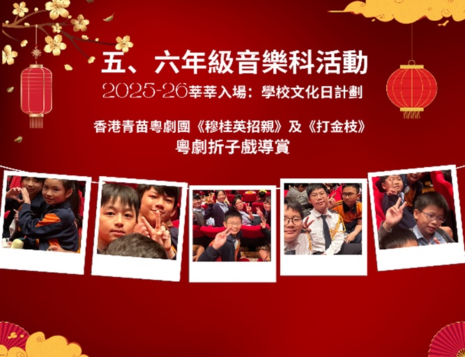 | 2025-10-28 -最近更新- 音樂科活動: 參加香港青苗粵劇團演出的《穆桂英招親》及《打金枝》 粵劇折子戲導賞: 五、六年級同學在這次粵劇折子戲導賞中除了認識了粵劇的「唱、做、唸、打」,亦欣賞了武場折子戲《穆桂英招親》及文場折子戲《打金枝》,更有機會觀看身段示範,如踢腿、雲手、拉山等動作。同學表現十分投入,亦樂在其中。[連結] |